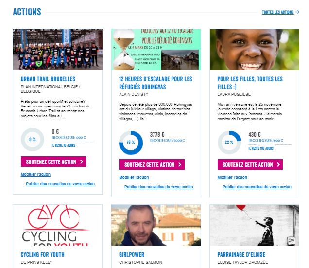 - Trouvez l’action qui vous correspond. Une fête d’anniversaire, une naissance, un événement sportif? Sur notre plateforme de crowdfunding, il y a de la place pour chaque action. Laissez-vous inspirer: